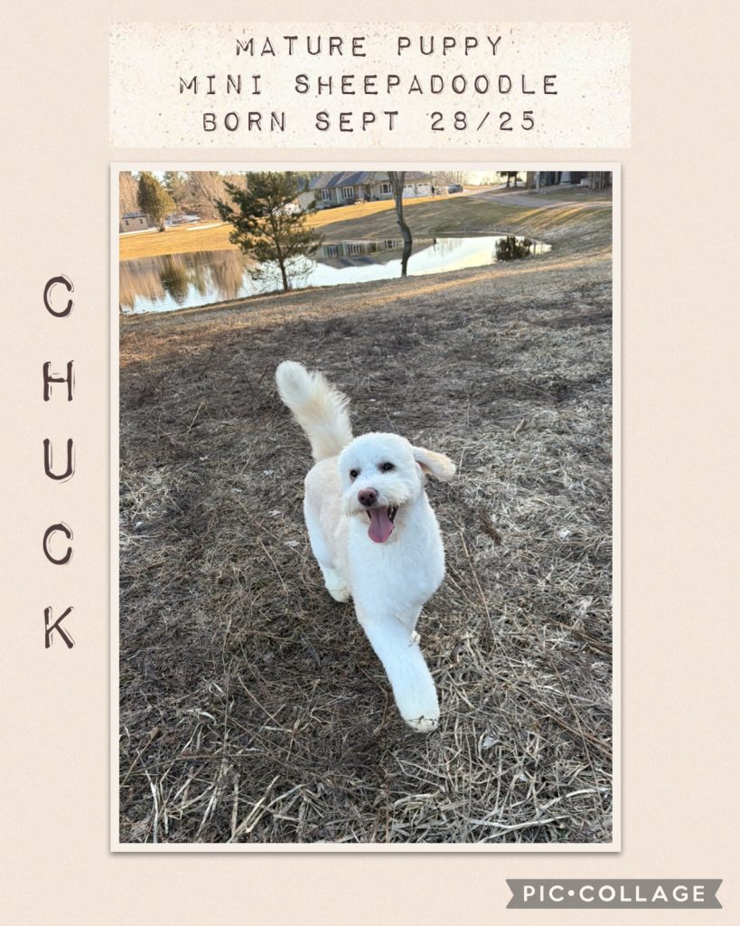 The size of these pups is expected in the 25 – 45 pound range give or take some. There could be a bigger or smaller one than average since there is Old English Sheepdog and Mini Poodle in their genetics. I expect the boys to bigger and the girls slightly smaller. For matured height at the shoulder the range expected is 16 – 19 inches high.