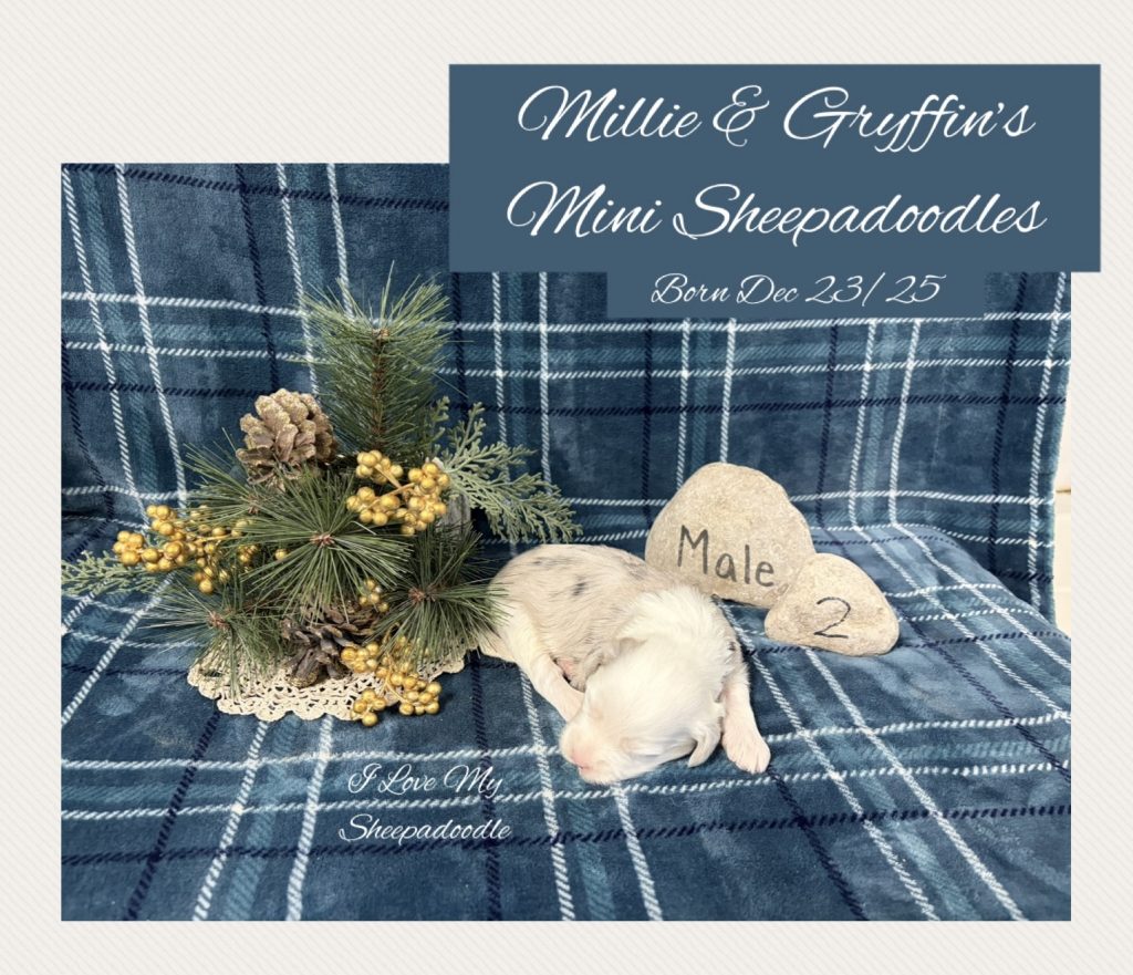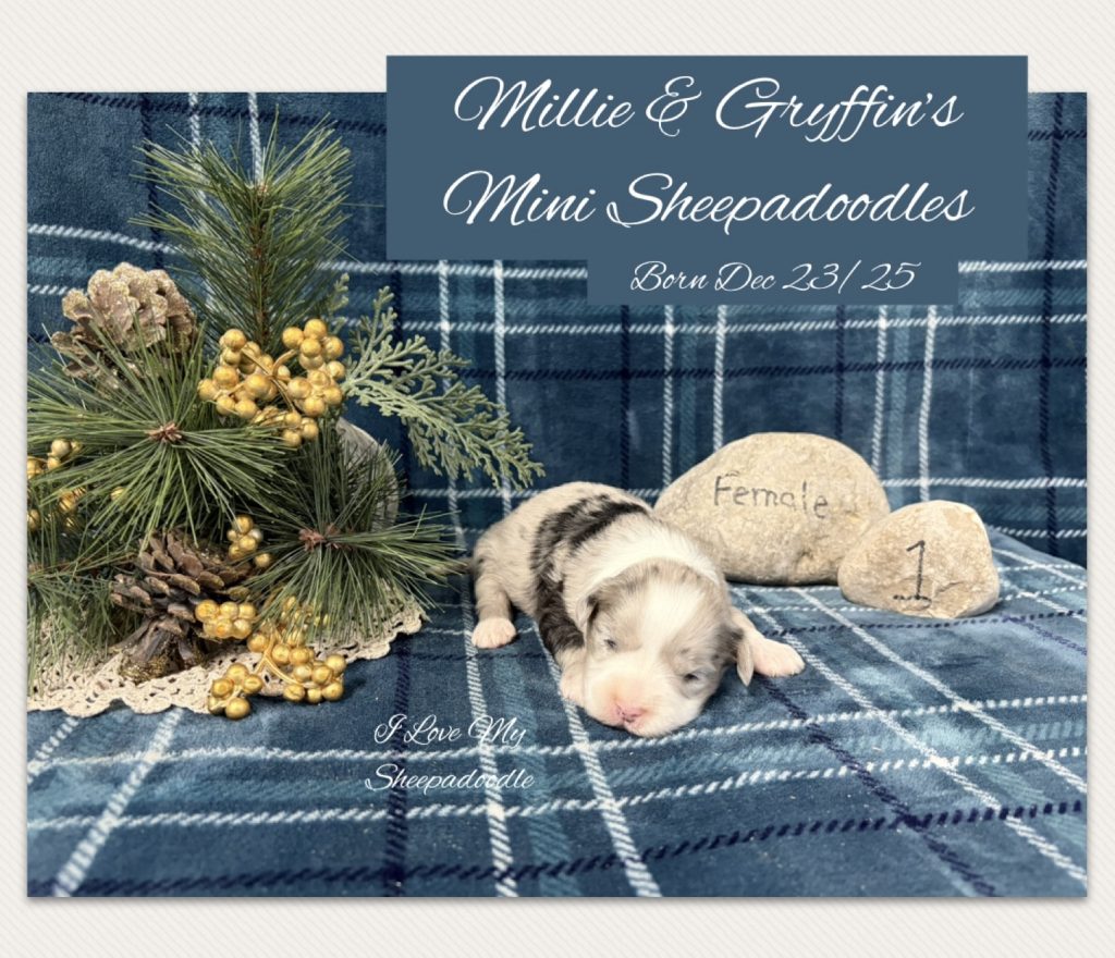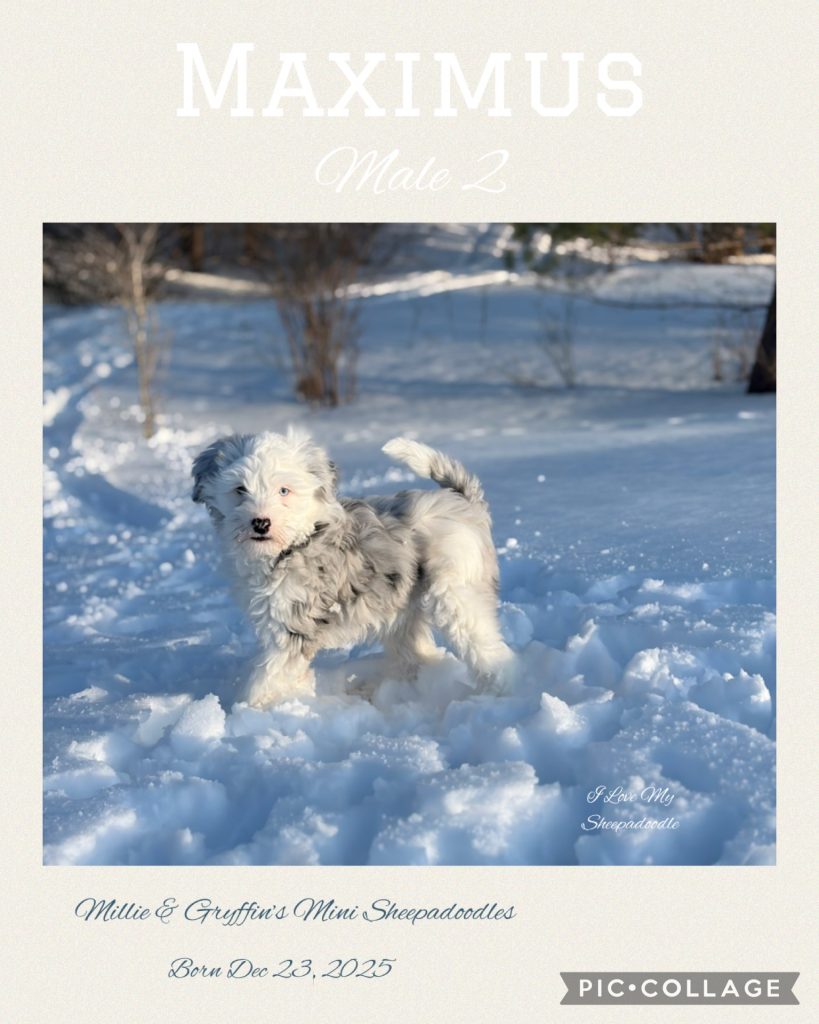 Millie is a sweet, gentle, kind natured girl. She has a lovely soft wavy coat in the light blue merle & white markings. She comes from lovely parents of our own lines here at I Love My Sheepadoodle. Her mom is Maya and her dad is Einstein. We kept Millie back because she was one of the nicest natured pups we have seen! Plus she is super cute! She is a smaller mini Sheepadoodle standing about 16 inches at her shoulder and weighs around 25 – 30 lbs. Millie is most gentle and is kind to all. She enjoys hanging out with us and her doggy friends. Millie’s first litter is planned to arrive Summer 2025 and after.