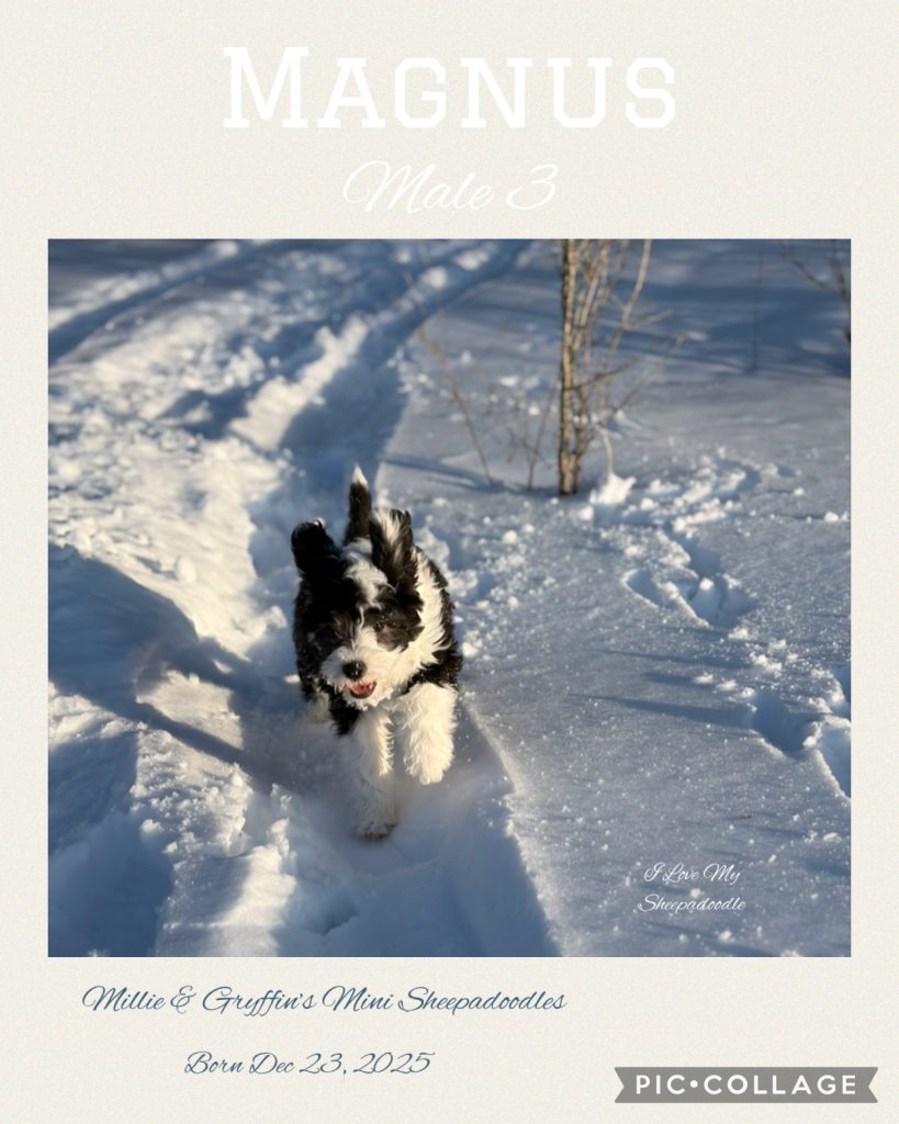Gryffin is a smaller F1 Mini Sheepadoodle weighing in around 25 – 30 lbs and standing about 18 inches high at the shoulder. He has a lovely tuxedo coat which we look forward to seeing in his puppies. He is a true gentleman! He lives with his guardian family in the Waterloo area along with his Sheepadoodle playmate Callie! They are well loved by their 3 little people and guardian parents. Gryffin is a joy to have and we are thankful for this little man!