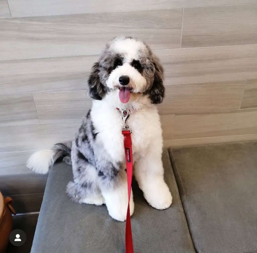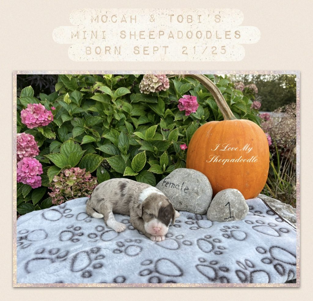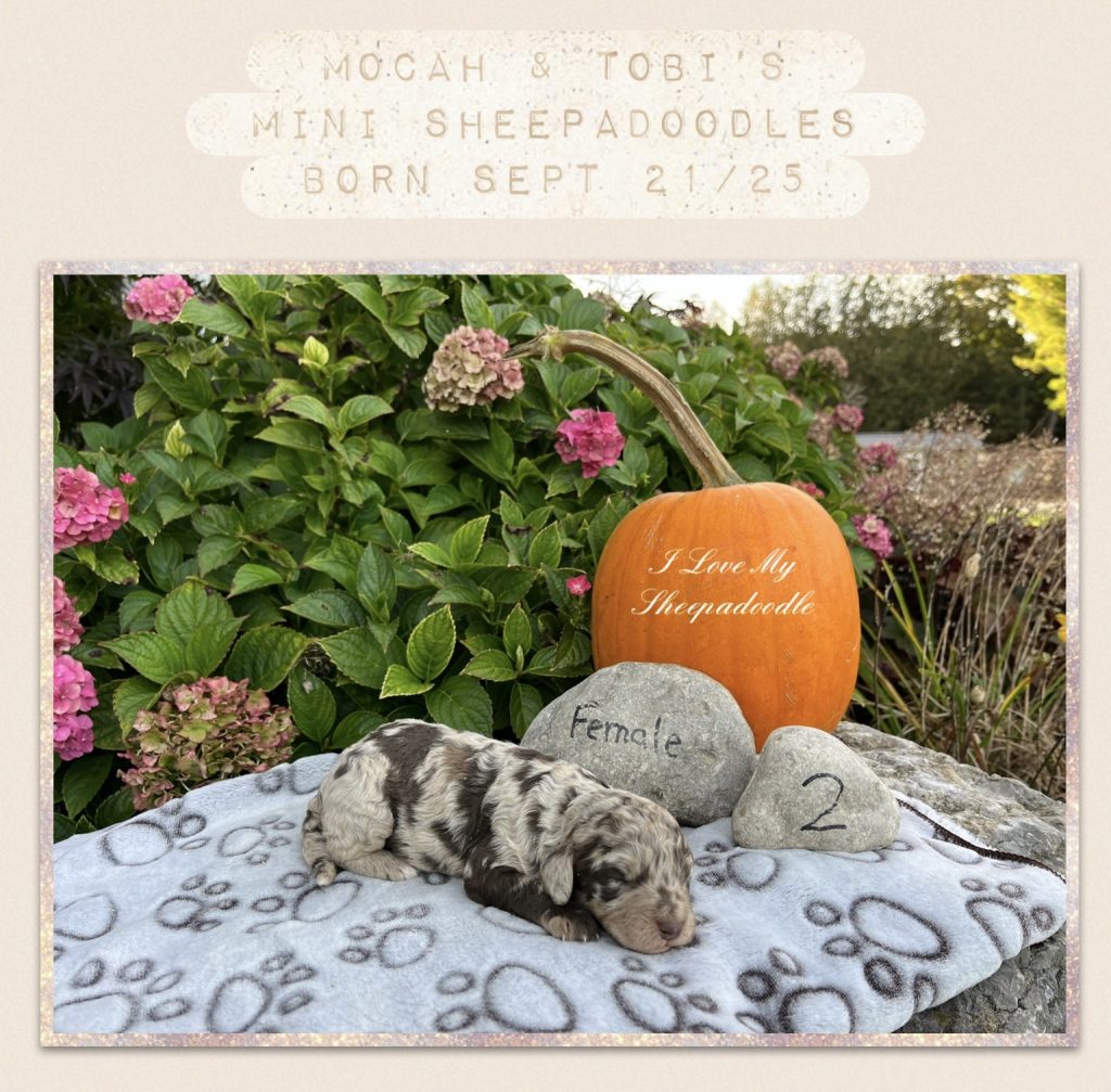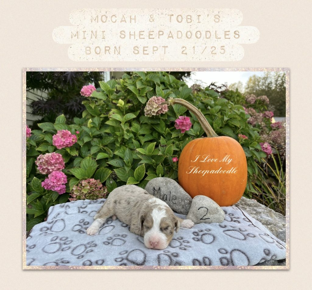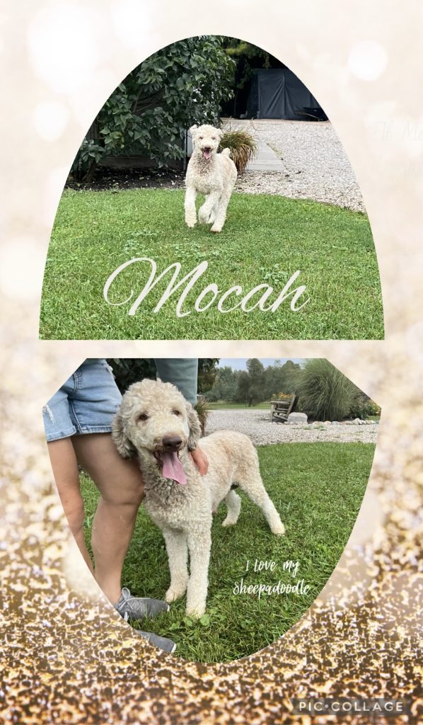 Mocah is a chocolate phantom F1b Moyen Sheepadoodle weighing in around 45 lbs and about 20 inches high at the shoulder. She is friendly and social and enjoys meeting new people and making friends. Mocah’s coat reminds us of a chocolate Mars bar, she has light caramal socks and a chocolate coloured coat. Her coat is soft, silky and wavy and is gorgeous grown out. She is 75% poodle and 25% Old English Sheepdog. Mocah has passed her OFA prelims with Good Hips and Normal Elbows. She is cleared by parentage for Genetic DNA health clearances. Her mom Gracie, a purebred poodle, and her dad is our Mini Sheepadoodle Wrigley. We are excited to have more lovely pups like her for others to enjoy!