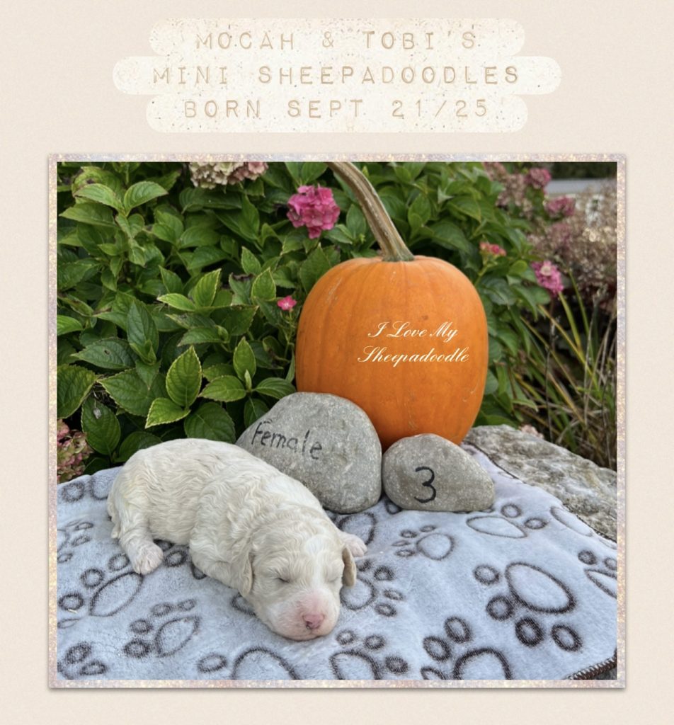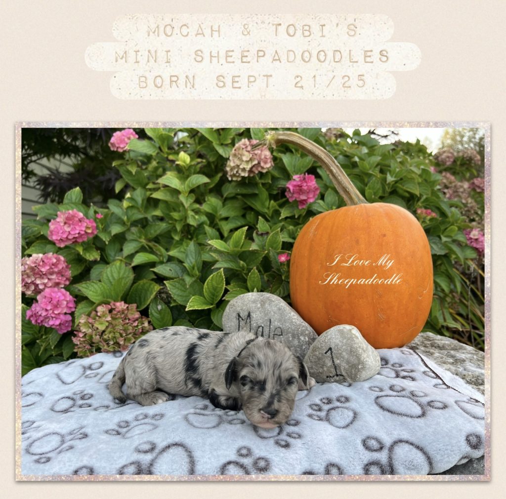 Tobi is such a sweet boy! His name says it all! He plays dress up and lets my kids take him along with them wherever they go. He also has his pass to the local nursing home where he can bring some more smiles. Tobi loves life and brings joy to those he meets. Tobi is 13.5 inches high and 16 lbs. He has passed his OFA prelims with Good hips and normal elbows. Tobi is registered with the Canadian Kennel Club. He is a lovely boy and produces beautiful pups inside and out! He will be father to our Moyen, Mini and Tiny Sheepadoodle pups!