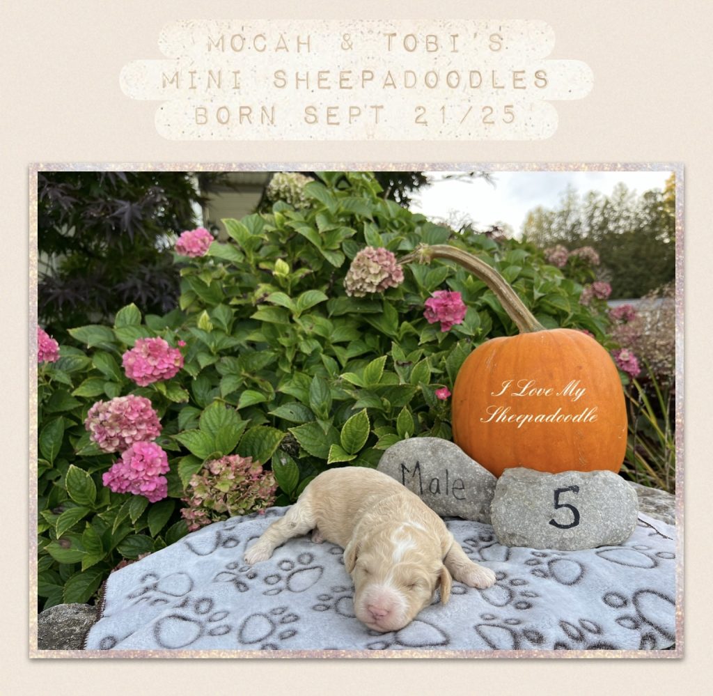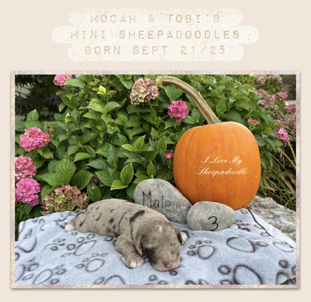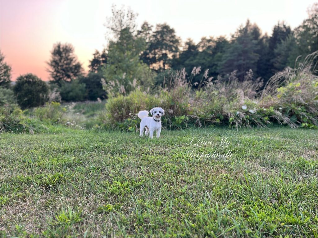 This is a F1bb litter making the pups mostly Poodle with a touch of Old English Sheepdog. They are great for allergies or those wanting a curly coat. Some of the pups have curly coats and some with a gentle curl/wave. Mocah is a F1b Moyen Sheepadoodle which is 75% poodle and 25% Old English Sheepdog. Tobi is our favourite mini poodle stud here. He is our family dog and makes great pups!! Theses puppies will be hypoallergenic since both the Poodle and Sheepdog are hypoallergenic breeds.