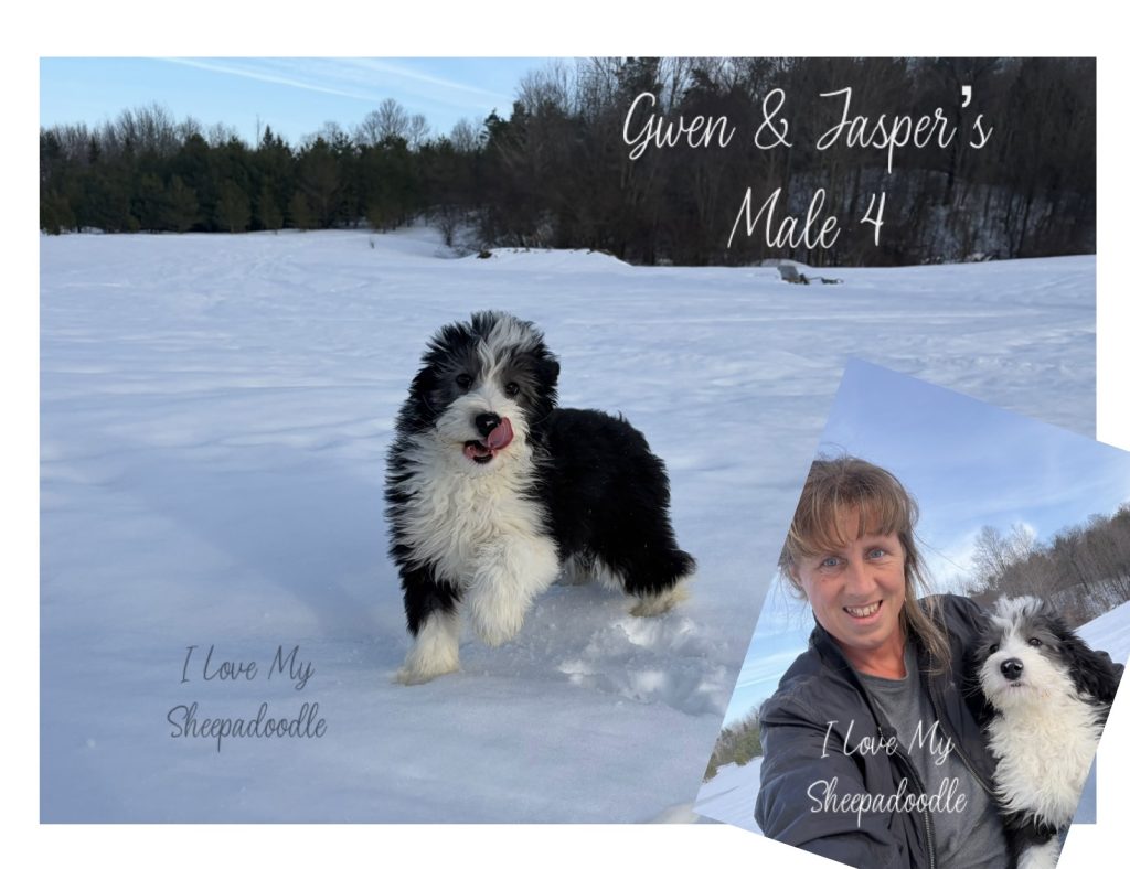 Meet Oliver – Male 4 – from Gwen & Jasper’s litter. Oliver is a fun loving boy who also enjoys leaning in for snuggle time. He has a soft, wavy hyperallergenic coat. He is a big boy and loves to eat! We expect him to be around 50 lbs matured or so. He is medium energy. If you like the Old English Sheepdog look, he’s the one! If you are looking for a great companion pup, he’s just the one you’ve been waiting for!