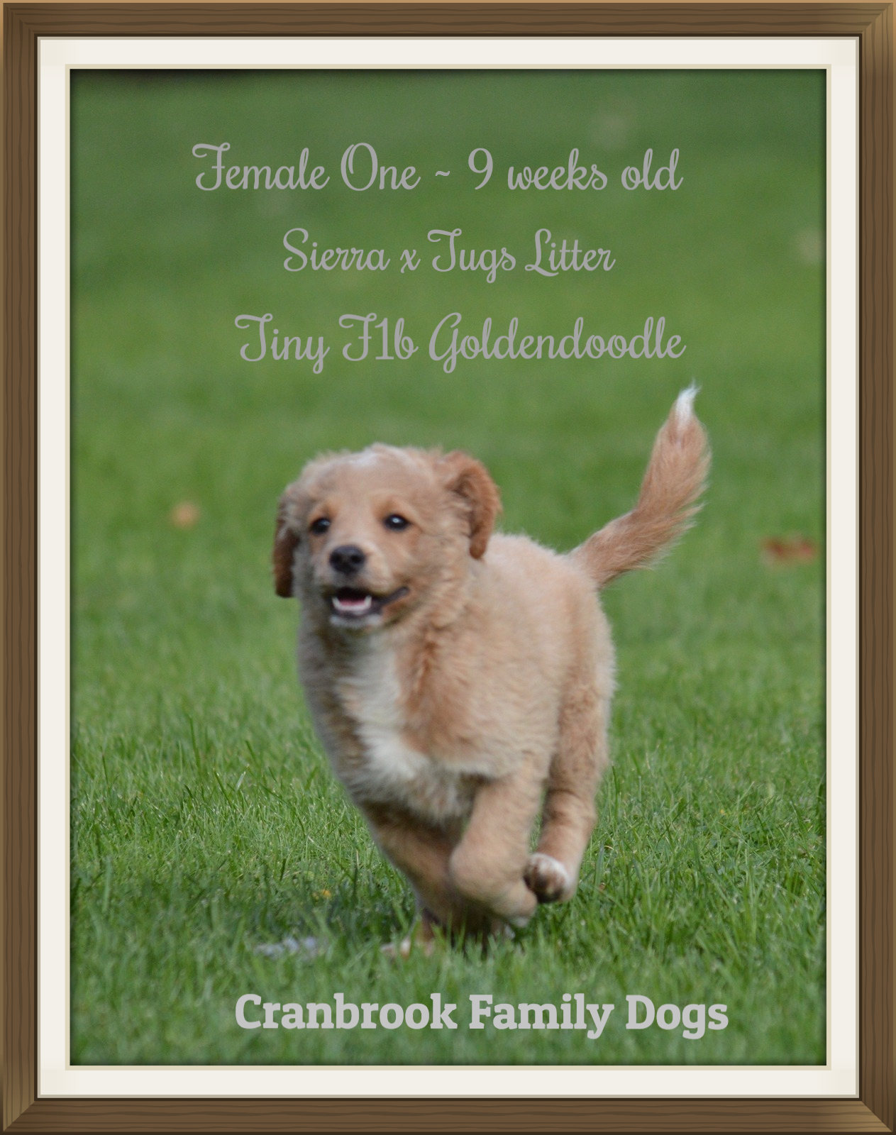 We have one Tiny F1b Goldendoodle available from Sierra x Tugs summer litter. “Honey” (Female One) is sweet, affectionate and a playful entertaining girl. She has a soft fluffy short coat and will likely not have a mustache. She has some really nice white markings on her chest, and paws. She should mature out to be around 17 lbs. She is our only F1b puppy that will be available until summer of 2017.