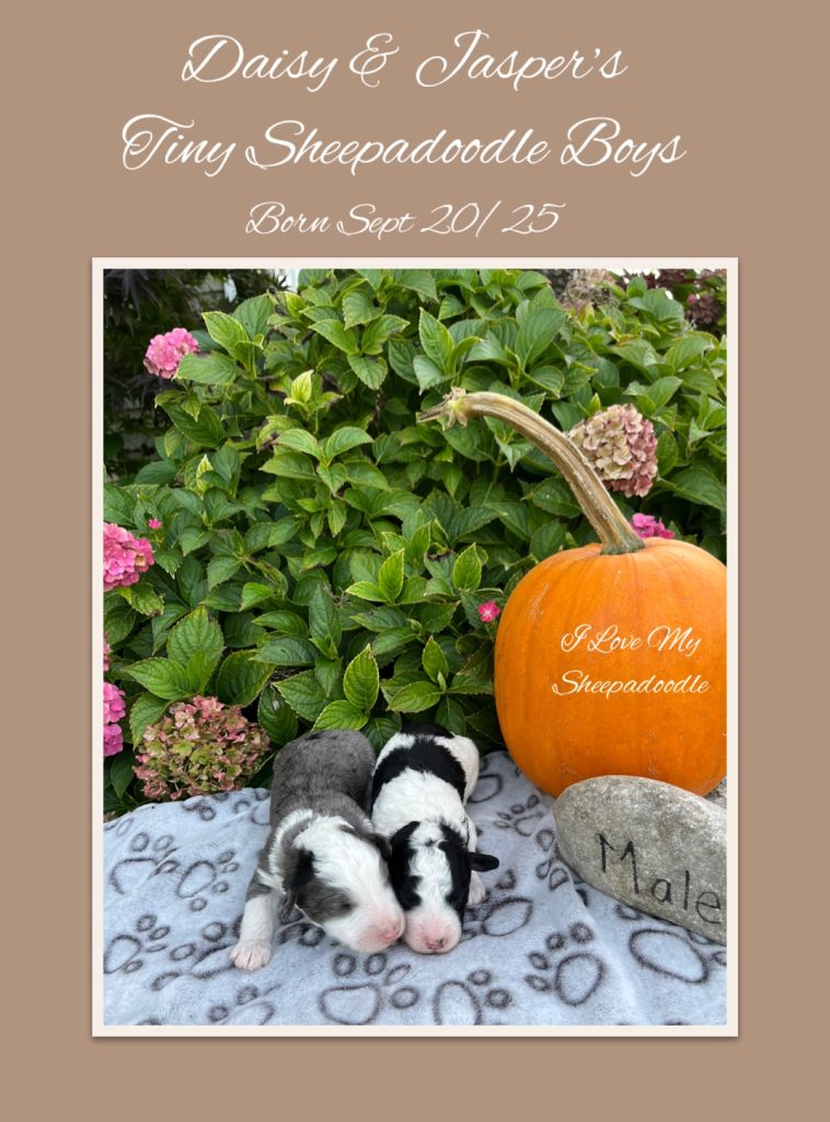 This litter is like a F1b Sheepadoodle litter since Jasper is has a F1 Sheepadoodle coat and Daisy has a poodle coat. You will see some curly coats and some wavy coats coats in this litter but it is predominately curly. These pups are hypoallergenic with very little to no shedding expected.