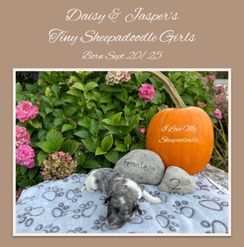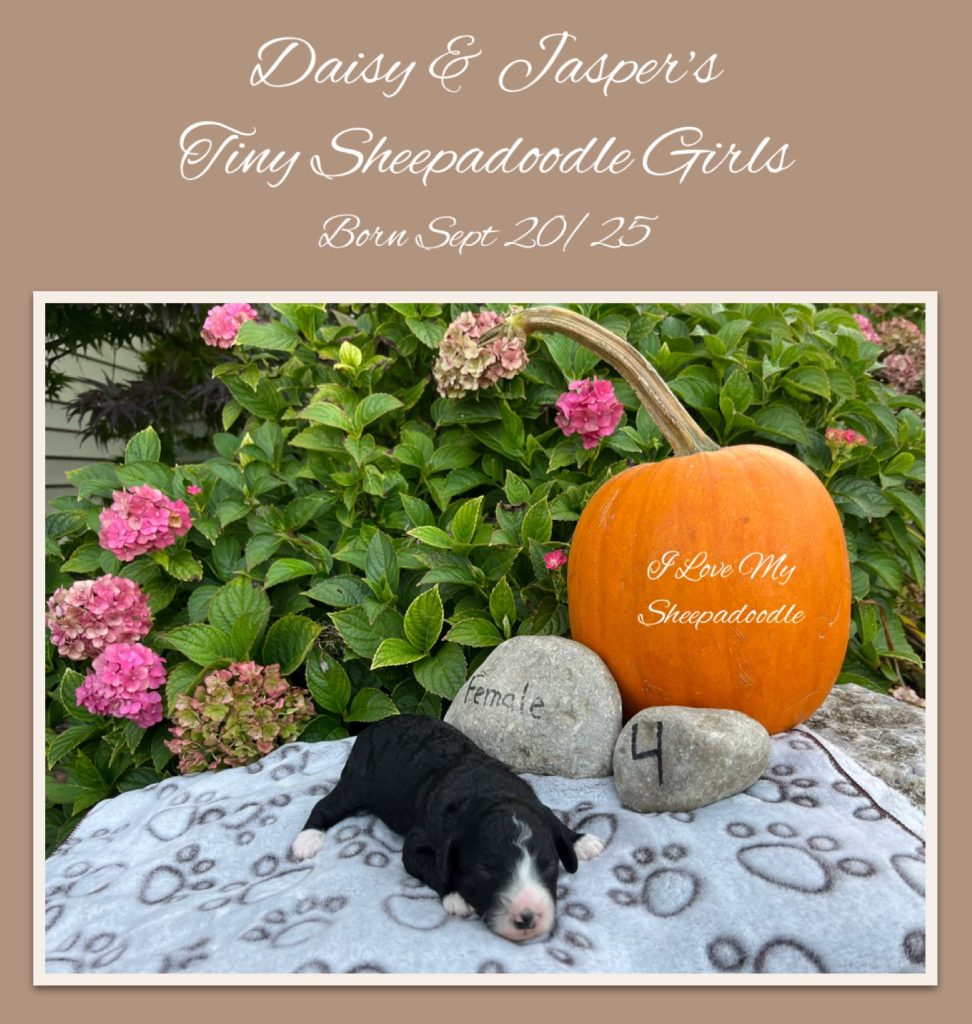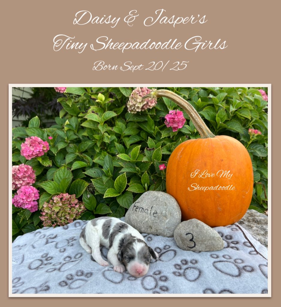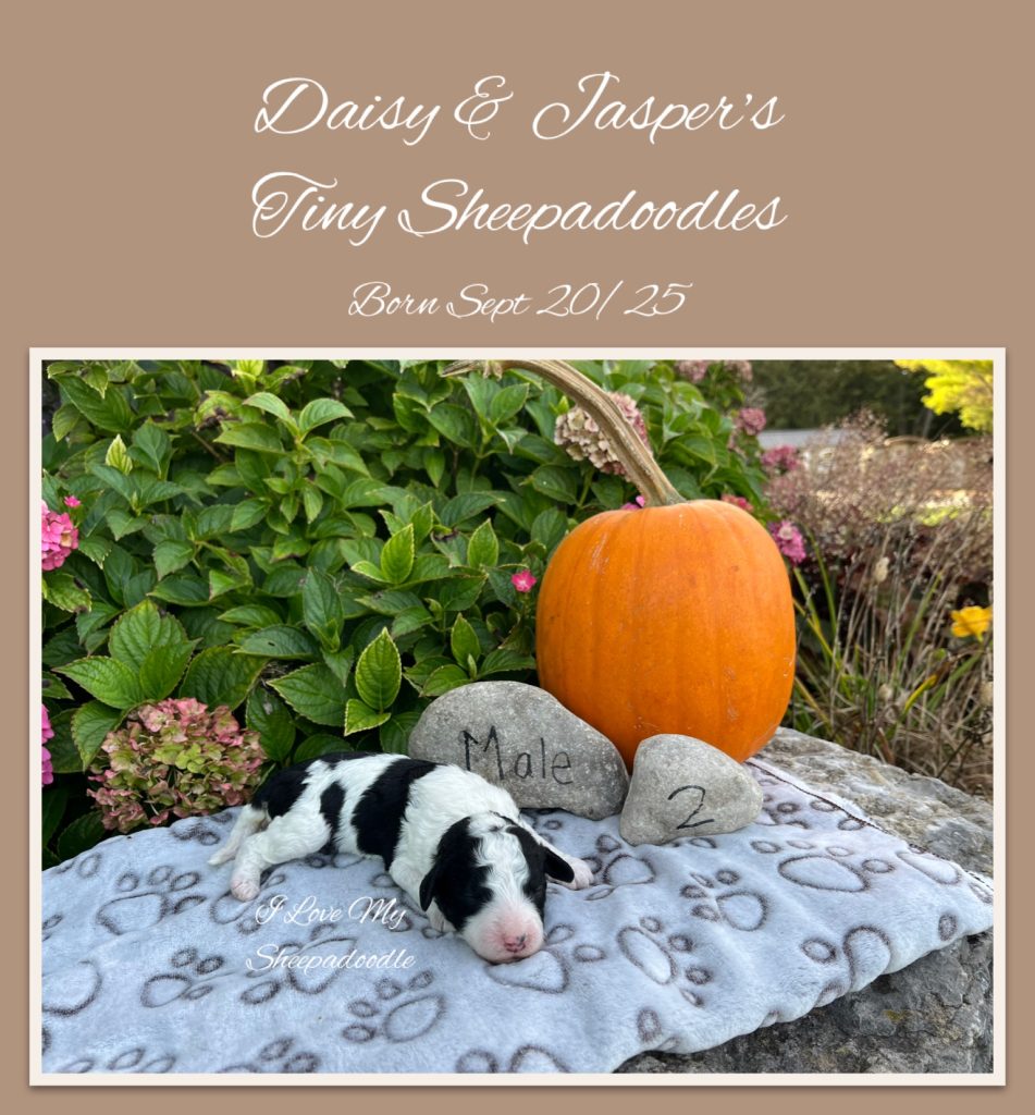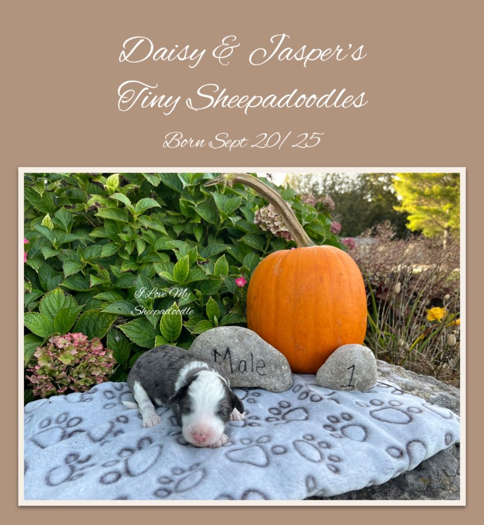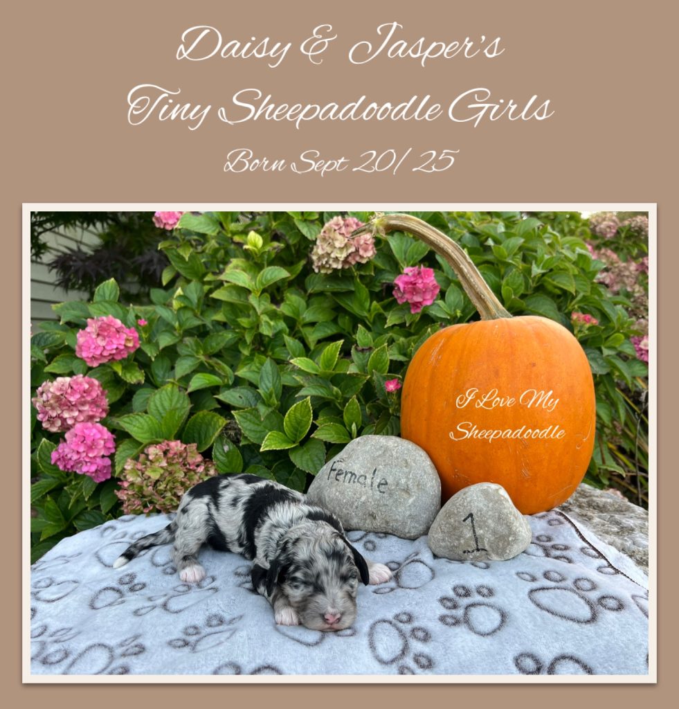 We are happy to introduce Daisy and Jasper’s litter of Tiny Sheepadoodles. We have 2 boys and 4 girls in this litter. The temperaments of these pups should be great! Daisy is sweet and affectionate, calm and cuddly. Jasper is a bright boy who gets along well with other dogs.
