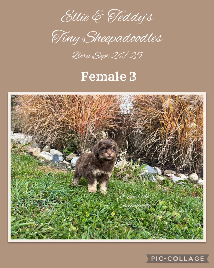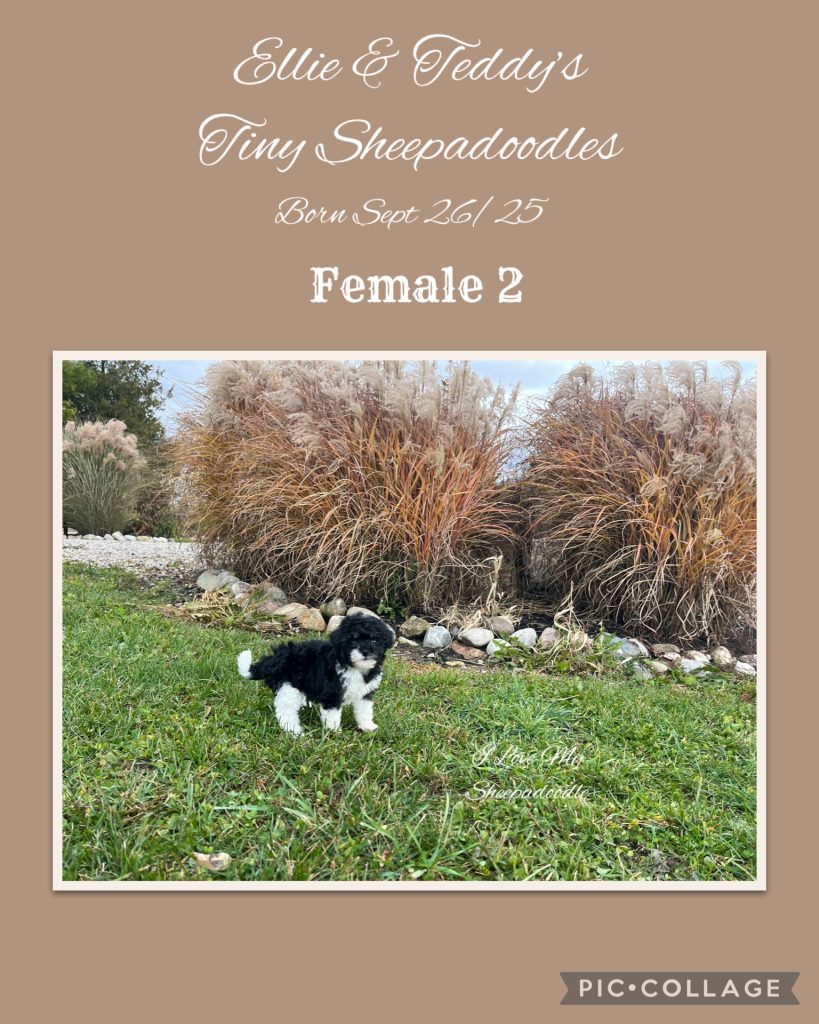 Ellie is an outgoing, friendly, playful Sheepadoodle. She enjoys playing and being with people. She enjoys her zoomie time in the evening with her family. But also will hang out and chill with her family too. Ellie is about 17 lbs and about 15 inches tall at the shoulder. She has a soft wavy coat. Ellie comes from some of our favourite dogs here in our breeding program. Her mom is Kitty – a kind and soft hearted F1b Tiny Sheepadoodle from our own program. Her dad is Gryffin, a friendly smart F1 Mini Sheepadoodle. Ellie is 37.5 % OES and 62.5% Mini Poodle. We look forward to Ellie’s pups and the solid genetics that are behind her lines. They should be a good family friendly Sheepadoodle companion!